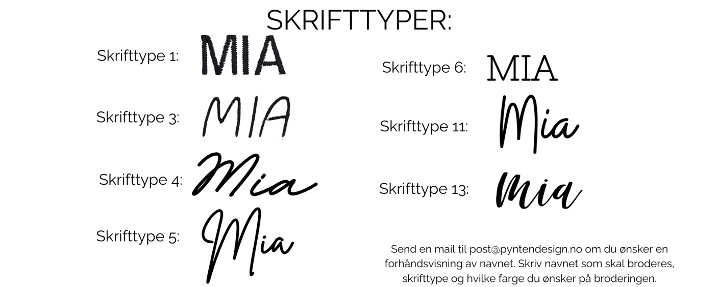 For oversikt over alle skrifttyper og trådfarger TRYKK HER